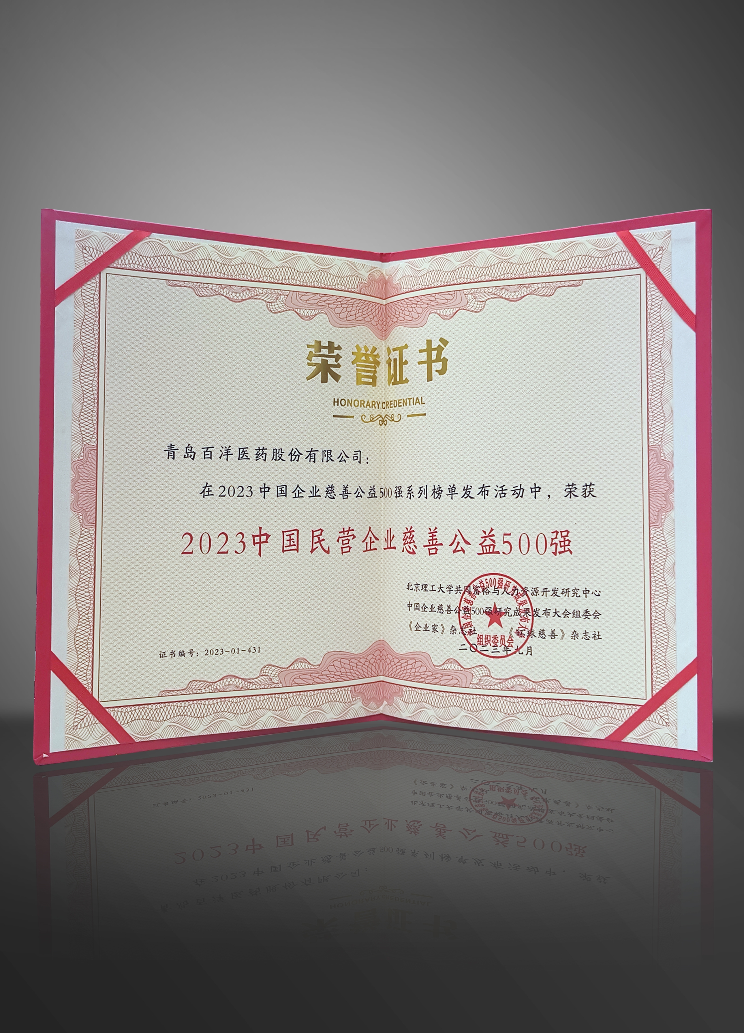 2023年百洋医药荣获中国民营企业慈善公益500强